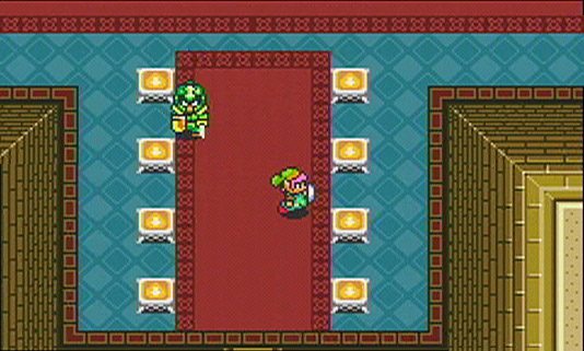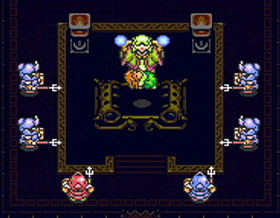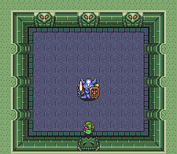 After an arduous battle, Link manages to get the upper hand on these statues and defeats them. Link has gained more experience points. No sooner then Link sheaths the sword away, the room begins to bend and warp, the room has been trapped by Agahnim. Link had been expected. He falls to the floor in a struggle. In a few seconds, Link is subdued and is knocked unconscious.