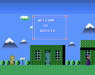 Link lands and walks out of the cave, it is the peak of the day, a bright blue sky sets the background. Only a few clouds overhead can be seen. A bustling town can be seen from the hills Link is standing on. Just before the entrance to the town Link reads a sign post : "Welcome to new Kasuto town." There are town folks aplenty and many shops selling various foods and items. This town is one of the largest towns in the Hyrule Kingdom. Link carries on walking, looking for possible clues and maybe a place to rest. A young lady walks up to Link and introduces herself. "Hello, my name is Malon, please let me help you, come inside to my house." Link is tired and decides rest would be the right course of action. Taking up Malon's offer, Link enters the house. Malon says to Link "I can restore your life force," Link feels his life force returning and soon feels strong again. Link thanks her. Malon mentions her Grandfather is the wise man of this town and suggests to Link that he should talk with him.