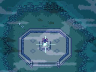 The trail Link has followed leads into a misty grotto, Link follows the trail further. Out of the grotto Link emerges in another area with towering trees, teeming with forest wildlife. The trail stops at some stone stairs, the stairs lead upwards to a stone platform. On top of the platform is a pedestal engulfed with rays of light, piercing through the tree branches. Inside the pedestal a large sword is placed upright, indeed as Sahasrahia said, this must be the master of blades.